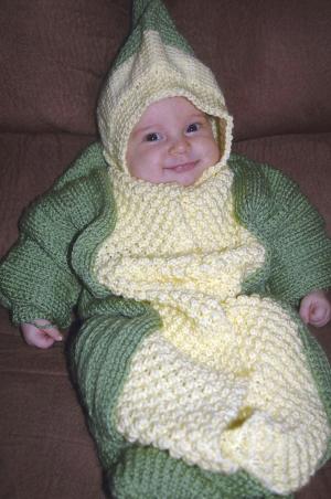 Baby s Corn Suit Baby Jack Wenzelbach is the apple of his family s eye and the corn cob bunting bag in his wardrobe knit by his mom really gives away his farming roots Parents Emily Metcalf and Spencer Wenzelbach Bowanville Ont enjoyed dressing Jack as a baby-sized ear of corn for Halloween Emily got the free pattern from the Lionbrand Yarn website www lionbrand com and used sportweight yarns knit with a popcorn stitch for the yellow creating the corn kernal texture and a vertical pattern combining the knit and pear stitches to make the green husk