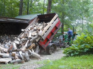 “We use it for hauling and dumping firewood and other jobs around our farm. It eliminates the need to unload wood by hand,” says Bond. “We use our Deere 2350 tractor to pull it. The dump truck sat in the woods until we decided to make a trailer out of it. We added wooden sides to the box to increase the capacity.”