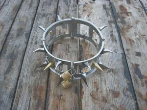 Both of the devices have holes to allow the animal’s coat to protrude through. The collar is hinged and locked on with a padlock so the dog can’t accidently lose it. The throat protector connects to the collar on top and is held on the bottom with a leather strap.