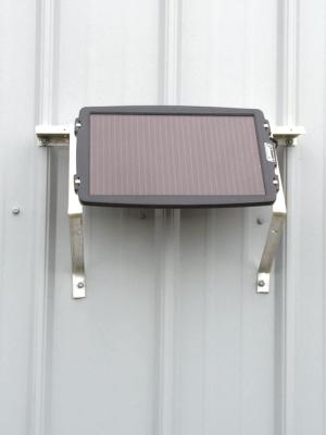 He went to the local Menards store and purchased a 3 1/2-watt solar panel ($34) that he connected to a 1050 CA deep cycle marine battery. He also purchased four 10-watt LED portable work lights ($19.95) that operate on 12/120v. He used scrap aluminum from old window frames to fabricate brackets for the solar panel and mounted it outside the barn.
