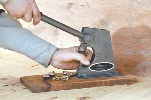 The nut cracker works by just pushing down on a handle. There’s room to wrap your free hand around the nut as it’s being cracked in order to keep bits of shell from flying around.