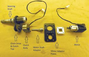 Laine attached a stepper motor with gear reduction to the clutch, attaching it in turn to a chain drive. He made adapters for both to mount them to the tractor and mounted a sprocket on the steering shaft. A #25 roller chain connects the chain drive on the clutch with the shaft. Signals received by the module are directed to the motor and the clutch for either remote control of the shaft or to disengage the clutch for manual control.