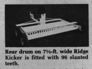 The 7-ft., 7-in. wide Ridge Kicker has two beaters driven by the front set of wheels. The front beater runs about 4 in. off the ground and knocks down the top of ridges while the back beater is fitted with 96 slanted teeth that run next to the ground and pulverize any clods and vegetation, throwing everything 5 to 8 ft. into the air. Working height of both beaters can be adjusted.
