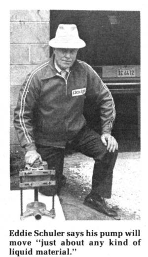 The $80 pump mounts on an adjustable metal bracket along with an electric drive motor. Assembled motor and pump stand just 14 in. high. The entire unit can be floated in a tire or on a wooden platform with the pump submerged. A 1/6 to 1/2 hp. motorù with either left or right-handdrive ù is needed to power the unit. For an extra $42.50, Schuler will provide one.
