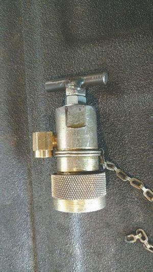 To use the tool, he connects the coupler to the hose and then gently screws the bolt in until it contacts the ball in the center of the coupler tip to relieve the pressure. The fluid comes out of the pipe elbow and can be collected in a Dixie cup.