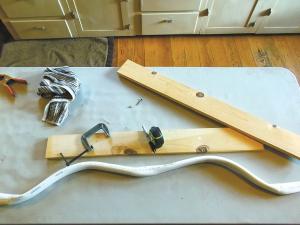 He started with a 5-ft. length of 1-in. dia. thick-walled pvc pipe, and marked the pipe at 1-ft. intervals and then marked the center at 2 1/2 -ft. Three inches on either side of the center line becomes the handle of the bow. Next, half of the length of pvc was heated until soft and pliable – Caleb used a stove top, but a heat gun can also be used. Once one end of the pvc pipe was heated, he used a 2 1/2 -ft. long jig with two 1-in. screws coming off one end of the board, set at 2 in. apart, to flatten the heated half of the pvc at a taper. This process was repeated on the other half of the pvc.