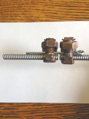 Another quick fix uses split-bolt and lug ground wire clamps. “The holes are big enough for the choke cables and a cotter pin or nail,” explains Podoll. “When you tighten down the lug, the cotter pin or nail locks both clamps together.”