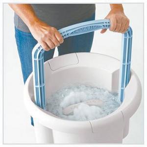 You place the clothes in the basket and close the lid, then place the basket in the bucket. Hold onto the handle and use an up and down motion about 10 times to drive a continuous flow of water through the fabric. Let the clothes soak for 5 min., then repeat the up and down motion 10 more times. A drain cap at the bottom of the bucket is used to drain the water from the bucket.