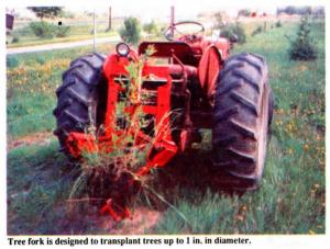 "I plant trees close together as seedlings to make them easy to cultivate. After 2 to 4 years, I move them with my tree mover to a windbreak or woodlot," says Brehmer, noting that his tree fork is designed to trans-plant trees with trunks up to 1 in. dia.