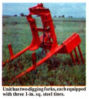 It consists of two digging forks, each equipped with three 1-in. sq. steel tines. The forks mount on pivoting brackets that are controlled by a single hydraulic cylinder.