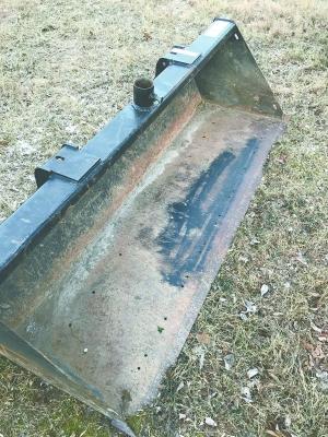 The attachment is a short steel pipe welded on top of the bucket to form a “cup” to lift the camper’s king pin. A bolt on one side of the pipe holds the hitch, and a small hole at the bottom allows water to drain out.