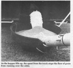 The spout consists of five "bottomless" buckets, one inside the other and all connected by two nylon straps and one thin chain strung through "eyes" along the upper lips of the buckets. To use it, you simply fit it to the endgate with the attachments provided and back up the auger hopper where you want to dump it. As the hopper fills up, the bucket spout stops the flow of grainfrom running over the sides. When the truck box is lifted to dump the rest of the grain, you simply shorten up the bucket spout with straps on the side, and keep dumping.