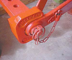 “The drawbar on these tractors is mounted between the 3-pt.’s lower lift arms and fitted with a series of holes. It tends to flop around, which is a problem if you want to use a ball hitch on it in order to move small trailers or boats,” says owner Phil Smith. “Our cast iron drawbar lock slides over one end of the lift arm, and uses a rectangular hole to lock the drawbar in place.”