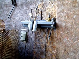 To store the tools, he bought a 1-ft. long tool rack and mounted it on the wall by the air compressor. He pop riveted a 3 by 5-in. piece of sheet metal onto the rack to make a friction bracket that holds a 30-in. curved blow gun, as well as a dual tire inflator, a 1-ft. long blow gun, a 2-ft. long straight blow gun, and a 30-in. straight blow gun with the end cut at a 45-degree angle. All blow guns are fitted with 1/4-in. steel brake lines and can be quickly connected to the 175 psi stationary air compressor, which is set up next to the wall-mounted rack. The 50-ft. hose is stored on a garden hose rack mounted to the motor base of the compressor.