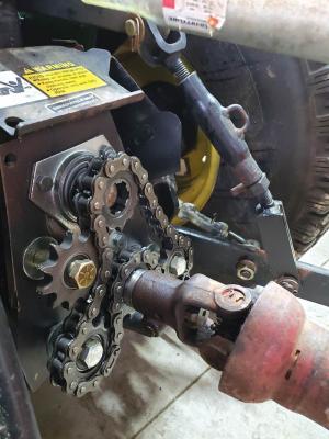 Olds welded a bearing collar onto the end of each pto shaft and also mounted a hub and gear onto both shafts. The add-on pto has a slide-on hub welded onto it and is driven by a no. 60 roller chain. The chain runs around a pair of sprockets and an idler sprocket and causes the add-on pto to rotate counterclockwise.