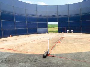 Skaro’s deep blue 20-ft. tall by 52-ft. dia. Slurrystore now holds a regulation-size Pickleball court, with line markings painted onto the concrete floor inside the steel circular walls. “The solid walls make it a little noisy when people start complaining about missed shots or losing a game,” Skaro says. “On the other hand, if we have music playing the walls give us perfect surround sound.”