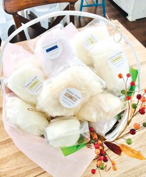They make two sizes. Clouds ($6) are larger, similar in size to cotton candy sold at carnivals, and the smaller Pops ($3) are a great favor size for a treat. In addition to the other fruit flavors, they have strawberry, grape, lemon-raspberry, holiday flavors and coffee.