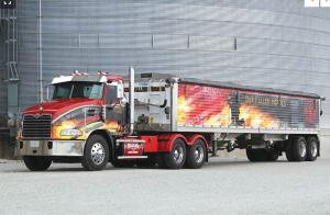 Mercier says he initially wanted his 2005 Mack semi-tractor painted red to show his allegiance to firefighting. That idea expanded into wanting a painted trailer, which turned out to be too expensive. Eventually, he worked with Chad Brosseau of Fastlane Wraps to produce a stunning and fiery decal for the grain trailer.