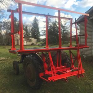 To raise the scaffold higher, he welded 3 by 3-in. square tubing to the underside of the lift for his tractor’s 3-pt. hitch forklift attachment forks to slide into. For extra safety, he drilled holes through the forks and inserted bolts to secure the scaffold. Yax also covered the deck surface with gritty Rustoleum truck bed coating for a non-slip surface.