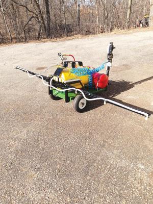 The sprayer is powered by air pressure, which is supplied by a portable tank onto which Bunniss attached a 125 lb. relief valve. This holds enough air to spray two tanks of liquid. Everything on the sprayer is designed for variable spraying rates. The pressure, tips that you use, and the speed you are spraying, are all factors when determining how much weed spray you want to use per acre.
