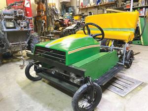 He began with old bed rails for the frame, which he covered with fitted plywood body pieces. He wanted something inexpensive for wheels, so decided on bicycle rims and tires. For the hood, he salvaged an old lawn tractor hood and cut it to the right size and shape.