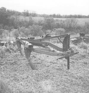 Doug Gratz, who farms near Readstown, already had the old Deere 4-bottom semi-mount plow. It was equipped with trip standards that "kick back" whenever they hit a rock. He removed the moldboards and cut off the beam about two thirds of the way back. He cut off the second and fourth shanks and used sections of the shanks to make "shovels" that weld at an angle to the bottom of the remaining two shanks.
