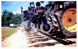 It consists of a heavy-duty 7 by 7-in. toolbar fitted with a fluted coulter up front followed by a specially-designed subsoiler knife with a pair of wavy coulters on either side.