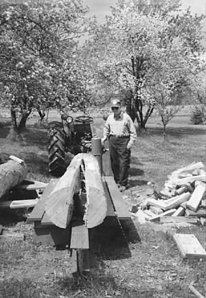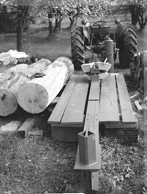 Smith first made a splitting table with a long H beam down the center and pieces of 8-in. channel iron on either side. A 4-way splitting head mounts toward the front to split 16-in. long chunks into four pieces of firewood at a time. To split logs up to 10 ft. long, a single splitting wedge is mounted at the end of the center H-beam. The same 6-in. dia. by 18-in. long hydraulic cylinder is used for both splitting operations. Power is supplied by tractor hydraulics.