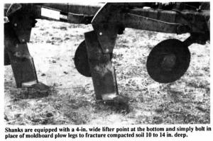 The shanks, 4-in. wide, 14-in. long, and 1/2-in. thick, are equipped with a 4-in. wide lifter point at the bottom. They simply bolt in place of moldboard plow legs to fracture compacted soil 10 to 14 in. deep.