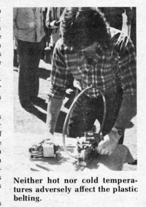 "Our permanent Plasti-Vee belts are made from a fibrous polyesther that has three times the strength of comparable rubber belts. They're formed by heating both ends of a length of belt - at 412? - and then sticking the ends together. The resulting weld has proved to be as strong as the rest of the belt," Cooks explains.