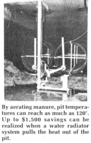 By aerating manure in the pit with a submersible pump to stimulate aerobic digestion, it heats up to as much as 120?. A heat exchange system circulates water through about 900 ft. of 1-in. pipe submerged in the pit and runs it up through radiators in the barn or other buildings. Sween says the system kept his approximately 4,800 sq. ft. barn heated to about 68? throughout the winter even though outside temperatures reached 20? below zero or lower. The system, minus the aeration pump, cost around $2,500. Sween says he saved $1,200 to $1,500 on heating costs and plans to add about 600 more feet of pipe to the system for use this winter.