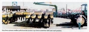 The toolbar planter, in transport position, rides on the four wheels of the center section and pulls (via the tractor's 3 pt. hitch) like a long twowheel trailer. It's equipped with two master cylinders - one for controlling the wing wheels and one for the four wheels on the center section. The outer sections flex up to 12? to follow contour-of the ground.