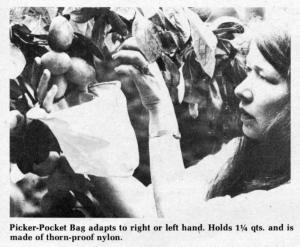 Tie Picker-Pocket Bag has a capacity of 1 1/4 quarts and is made of thornproof nylon. It has a suede top with holes for fingers and thumb. Can be used on either hand. A wire ring around the top keeps the bag open and an elastic loop on the outside allows it to hang underneath the picker's wrist so that berries can be dropped directly into the bag. It also can be used for cherry tomatoes and small beans.