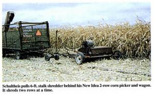 Flail Chopper Shreds Stalks Behind Picker COMBINES Corn Pickers(13) 19-1-18 "I've tinkered with mounting stalk shredders behind corn pickers for 30 years, but this is the best one I've come up with yet," says Carl Schultheis, Caro, Mich., who turned an old 5-ft. wide International flail chopper into a 6-ft. stalk shredder that he pulls behind his New Idea 2-row corn picker and wagon. It shreds two rows at a time.