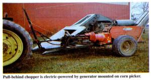 What makes the set-up unique is that the pull-behind chopper is electric-powered by a generator mounted up front on the corn picker.