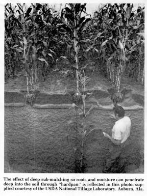 "When Sub-Mulcher shanks penetrate the soil, they cut, lift and fracture it up to 20 in. on each side," Herb Brown, president of B.C. Mfg., points out. He recommends sub-mulching corn stalks and other fields in the fall for deep penetration of winter and early spring moisture, then following up with submulching at planting time, or during or following cultivation of corn, soybeans and other row crops.
