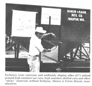 "In testing the prototypes, we used them to haul high moisture ear corn right from the picker. "We had no bridging problems whatsoever with regular high moisture ear corn, or ground high moisture corn," reports Erwin Denzin, designer and manufacturer. "We haven't tried it with finely ground oats or barley but I believe it will handle even this type of feed without bothersome bridging problems. It works great for handling high moisture ground corn as it comes out of the silo. You can load from the silo directly into the wagon, then use the cross conveyor and discharge chute to unload into a feeder auger or directly into a low-slung fenceline bunk."