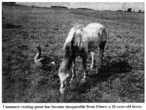 "We don't know where the goose came from, and we've never given her a name. We just call it, `that damn goose,' says Wenzel. "No one knows why he bonded with Elmer. A local veterinarian says the goose must have imprinted on a horse or bonded with it when it hatched about five or six years ago before coming to our farm.
