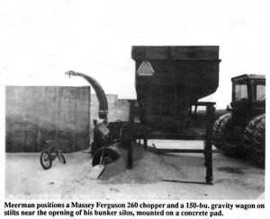 Labor-Saving Way To FIll Bunk Silos CROP STORAGE Silos (50) 14-3-35 "Our set-up for grinding high-moisture corn makes it easy to fill our bunk silos," says Steve Meerman, Coopersville, Mich., who positions a Massey Ferguson 260 chopper and a 150 bu. gravity wagon on stilts near the opening of his bunk silos, mounted on a concrete pad.
