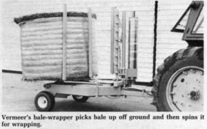 Vermeer's bale wrapper, called the Plastic Wrapper, mounts on a 2-wheeled trailer. It consists of a hydraulically operated bale fork that lowers to the ground to pick up balesand then raises to the vertical to spin the bale for the application of a couple layers of plastic. It also uses self-sticking plastic so no ties are needed. Once covered, bale fork drops the bale back to the ground. Plastic can be wrapped around ends of bale for a total seal. Cost per bale is about $1.00.
