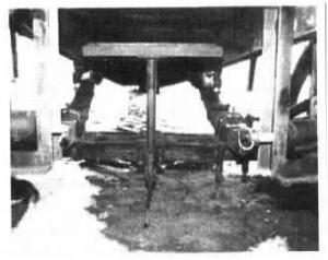 "It works so well my neighbors are always borrowing it," says Bauer. "I had been using a portable wooden chute, but it was clumsy and shaky to use. Also, the floor was too short and steep. My chute is only 32 in. wide so hogs aren't able to turn around inside it. I can use a crank to raise or lower the front end of the chute up to 20 in. to accomodate different trucks." Bauer clamped a hydraulic jack upside down onto the axle, welding the top end to a steel plate that's welded between frame rails. He removed a shackle from the end of each leaf spring and bolted a pair of 20-in. long channel irons on between the spring and frame. To hold the chute in the raised or lowered position, he pulls a pin from the channel iron, cranks the jack, and inserts the pin back into a different hole.