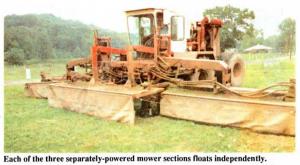 The one-of -a-kind mower is powered by a 235 hp Detroit diesel engine and equipped with 28.00 by 26.00 tires. Each of the three independently-powered 10-ft. 9-in. wide mower sections consists of eight 12-in. dia. Vicon rotary discs. The three sections float independently to stay close to even the roughest terrain. The sections overlap several inches. They fold up to a transport width of 16 ft. Cutting height, controlled hydraulically, ranges from ground level to 14 in.