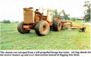 The rotary discs on each section are powered by three separate 50 hp hydraulic motors driven by three hydraulic pumps. The frame, axles, and steering gear are from a Champion self-propelled forage harvester. Waybright shortened the frame to an 11-ft. wheelbase. He mounted truck air suspension bags between the frame and mower sections for improved flotation. "We use an air compressor to fill the air bags so that the mower can 'bounce up and over obstructions, instead of digging into them," says Waybright. "The rig's Sundstrand hydro-static transmission allows infinitely variable speeds up to 10 mph. The mower can turn in a 15-ft. radius at the end of the field.