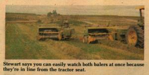 Zillah, Wash., farmer Bob Stewart custom-baled about 21,000 bales last year using the two ganged-up Deere 346 balers. "It does twice as much work and you eliminate the need for a second tractor and operator. You can easily watch both balers at once because they're in line from the tractor seat. In fact bale consistency improves because you can compare the speed at which bales get ejected to determine if one or the other baler is baling too light or too heavy," explains Stewart.