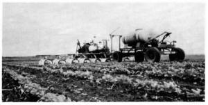 The system lets Jorgenson control weeds three ways: By banding Pursuit herbicide inside the hoods, by using drop nozzles to spray Roundup between hoods, and by broadcasting Pursuit with a 30-ft. wide "boomless" nozzle mounted behind the spray cart. A 15-gal. tank mounted above the spray boom itself contains Roundup and the 300-gal. tank on the wagon frame contains Pursuit. Jorgenson pulls both rigs with an old 1954 Fordson 40 hp diesel tractor.