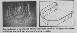 The Solution: "I reshaped the center feed discharge hole so it has a beveled rather than a straight edge. The beveled edge works like a funnel, allowing a much greater amount of loosened feed to fall directly into the space between the drag chain paddles and tunnel wall. With this modification, 75 to 100% of the feed cut loose by the cutting chain on each revolution enters and falls through the discharge hole.