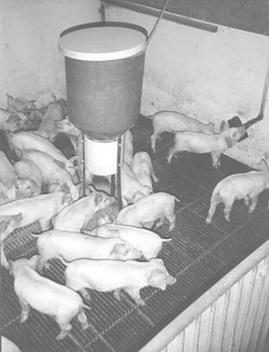 Labor-Saving Pig Feeder HOG EQUIPMENT & IDEAS Hog Equipment & Ideas (351) 20-1-10 Bob Willard, Mildmay, Ontario, got tired of always having to feed baby pigs by hand after they'd been weaned from their mothers. So he borrowed an idea from the fish farming industry to come up with his own automatic pig feeder that uses a timer and an electric motor to dispense feed at pre-set intervals.