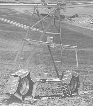 "The system provides 430 sq. in. of ground contact per tower instead of the 88 sq. in. with standard 11.2 by 24.5 tires. Ground pressure may be cut to as little as 3.9 psi," says sales representative Jeff Bettenhausen. "Most farmers start out by putting a set of tracks on a particularly troublesome tower that gets stuck easily or leaves deep ruts. Once they see how well they work they often add tracks to other towers. In some alfalfa fields the tracks just flat-ten the crop without destroying it. Also, the wheel ruts are shallow enough that you can drive a swather across them.