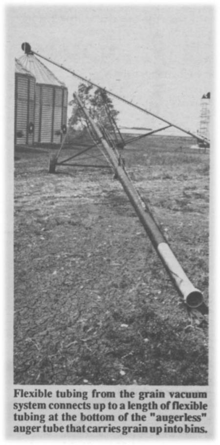 "It's saved me the cost of a grain elevator and leg system," says Cecil Manness, Domain, Manitoba, about his air-powered "blauger" grain mover which uses a grain vacuum, a 60-ft. augerless grain auger and 250 ft. of flexible 4-in. dia. tubing.