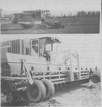 Last year FARM SHOW told you about an Iowa farmer who mounted a 12-row Case-IH air planter on front of his 1990 New Holland combine (Vol. 15, No. 6). Now Claas of America, Inc., and Purdue University engineers have teamed up to mount a Great Plains 3-pt. 15-ft. grain drill on front of a Claas 228 combine equipped with Caterpillar rubber tracks. Two carrier arms attach to the combine feederhouse and run up and over drill to the front side. Engineers have also experimented with carrier brackets that attach to the back side of drill. Their goal is to come up with a simple system that requires no modification of either combine or drill so both can be quickly converted back to conventional use. Experiments continue but, if successful, Claas may eventually offer drill or planter mounting brackets as optional equipment on all their combines.